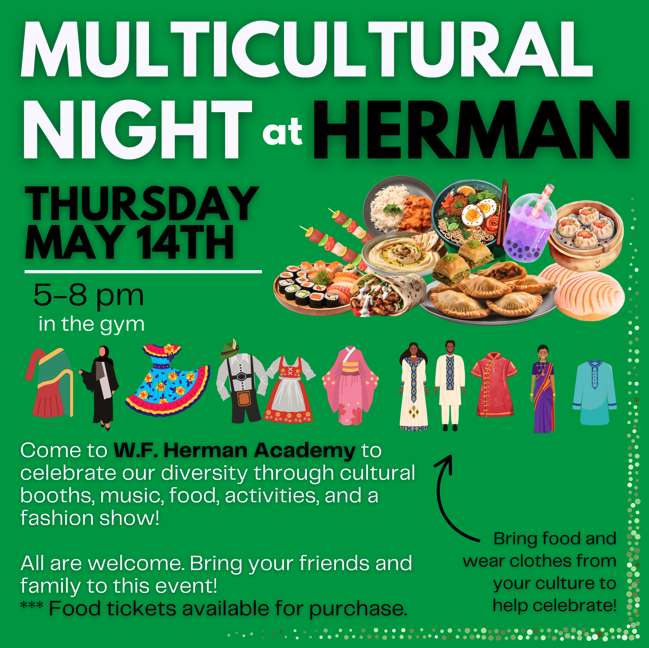 All are welcome to experience Herman's Multicultural Night (May 14 @ 5-8 pm) and Arts Night (May 20 @ 6-7:30 pm)